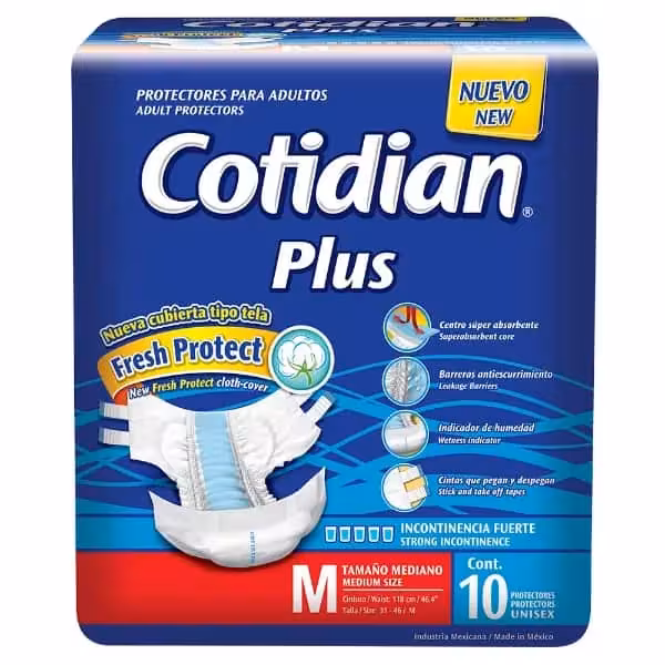 Pañal para adulto Cotidian Plus cuenta con una cubierta tipo tela, cintas que pegan y despegan, un centro súper absorbente, barreras anti escurrimiento, elásticos entre piernas e indicador de humedad.